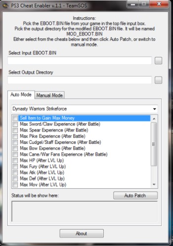 2. L'application contient 2 modes possibles : Auto Mode et Manual Mode. Auto mode est la méthode la plus simple d'utilisation puisqu'il vous suffit simplement de sélectionner votre eboot.bin, le jeu dont il s'agit et de sélectionner les codes triche que vous souhaitez. Le mode manuel nécessite de modifier le code hexa de votre eboot.bin.