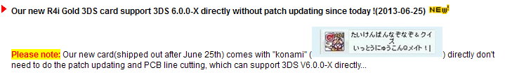 Aujourd’hui, le site officiel annonce que les nouvelles cartes R4i Gold 3DS qui sont sorties depuis le 25 juin supportent directement la 3DS 6.0.0-X, sans besoin de la maj.